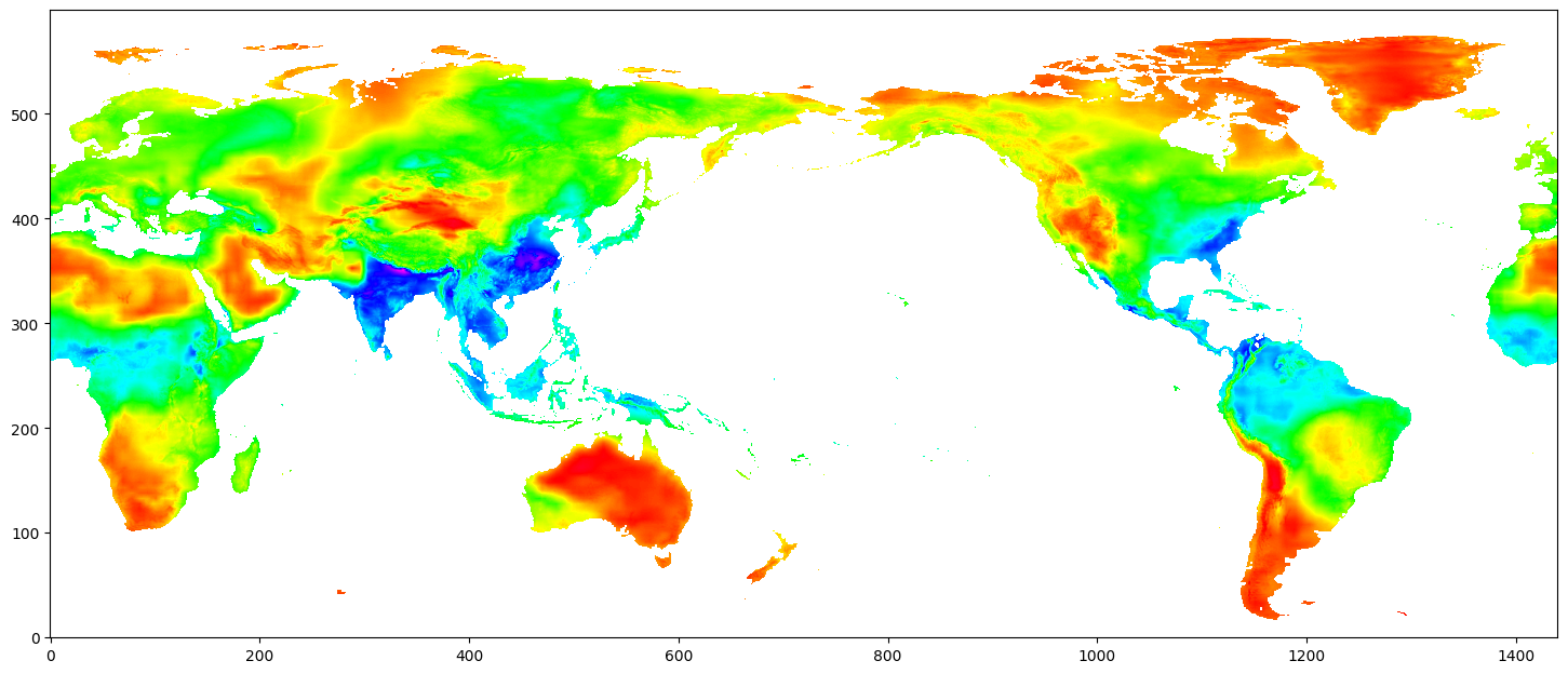import matplotlib.pyplot as pltmy_cmap ='gist_rainbow'plt.subplots(figsize=(18,9))plt.imshow(data, cmap=my_cmap,origin='lower') # matplotlib puts the origin on the top left instead of bottom leftplt.savefig( "NEX-GDDP-CMIP6_ACCESS-CM2_tas_ssp585_2020_day202.png")plt.show()